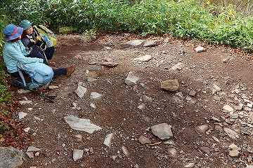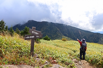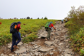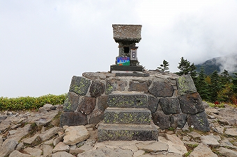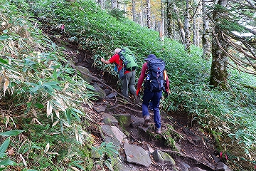 根子岳山頂で休憩後、四阿山を目指して出発です。進行方向右側が切れ落ちた登山道を進み、その先の大岩の間を進むと鞍部までの下り坂となります。 下りの途中で四阿山や浦倉山に通じる縦走路が見られました。鞍部から先が四阿山への登りになります。この先の登山道は木の根が張り出し、泥状にぬかるんでいてとても足下が悪い 場所があり歩きにくい状況が続きます。更に登山道の勾配もきつくなります。登山道を根子岳に向かう登山者とすれ違う毎に「気を付けて」が合言葉になりました。やっとのことで急坂を登り切ると 根子岳と四阿山の分岐に出ます。この先緩やかな登山道を進み木道の階段を登り、祠を過ぎると四阿山山頂に到着です。山頂からは、先ほど登った根子岳の姿を見ることができました。
