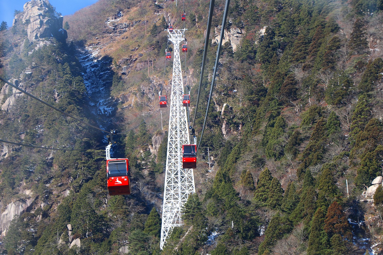 御在所岳の景色 前日の荒天から打って変わって晴天となりました。ホテルで食事を済ませ、御在所ロープウエイ駅の駐車場に車を止めロープウエイで御在所岳を往復します。当初、中道登山道が崩落で通行止めのため、裏道登山道を利用しての登山を予定していました。 ホテルで購入した前売乗車券で入場し、ロープウエイに乗車しました。グループ単位で乗車するため、乗車するまでに約20分を要しました。乗車してゴンドラの高度が上がると眼下には湯の山温泉街や遠くには伊勢湾が見られ、進行方向には対向するゴンドラや白い鉄塔、奇岩等が見られます。 ゴンドラから奇岩と言われる地蔵岩を探しましたが分かりませんでした。山上公園駅に到着後、駅舎内にあるロープウエイ博物館を見学し雪が降り積もった朝陽台広場を散策してリフトを利用して御在所岳に登りました。